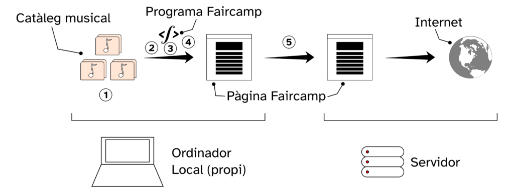 El 5è pas connecta el teu ordinador amb el servidor, des d’on el teu faircamp serà accessible des d’Internet. Si no tens un servidor ni cap domini, nosaltres te’n proporcionarem un i no t’has de preocupar massa per la seva configuració (serà un aprenentatge pel futur!).