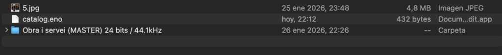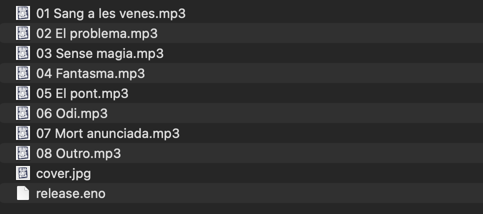 Cada àlbum que pugeu ha de contenir aquest arxiu. El seu funcionament és molt semblant a l’arxiu artist.eno. A la carpeta de l’àlbum també heu d’afegir la imatge de l’àlbum i recordeu que, com en el cas anterior que us explicàvem, és molt important afegir la descripció per complir amb els criteris d’accessibilitat i evitar errors al Fairplayer.