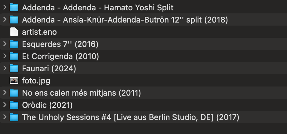 Cada carpeta d’artista ha de contenir un arxiu d’aquest tipus. És molt important especificar el permalink d’aquesta artista (serà l’URL i ha de ser única en el vostre faircamp, sense espais ni caràcters especials). En aquesta carpeta també hi ha d’haver la foto de l’artista i que a l’arxiu artist.eno afegiu una petita frase de descripció d’aquesta imatge. Aquest últim punt és important, ja que si no completeu aquest camp apareixerà un símbol a la portada del Faircamp un cop el pengeu i un cop indexat al Fairplayer podria donar-vos algun error en la detecció de la imatge.